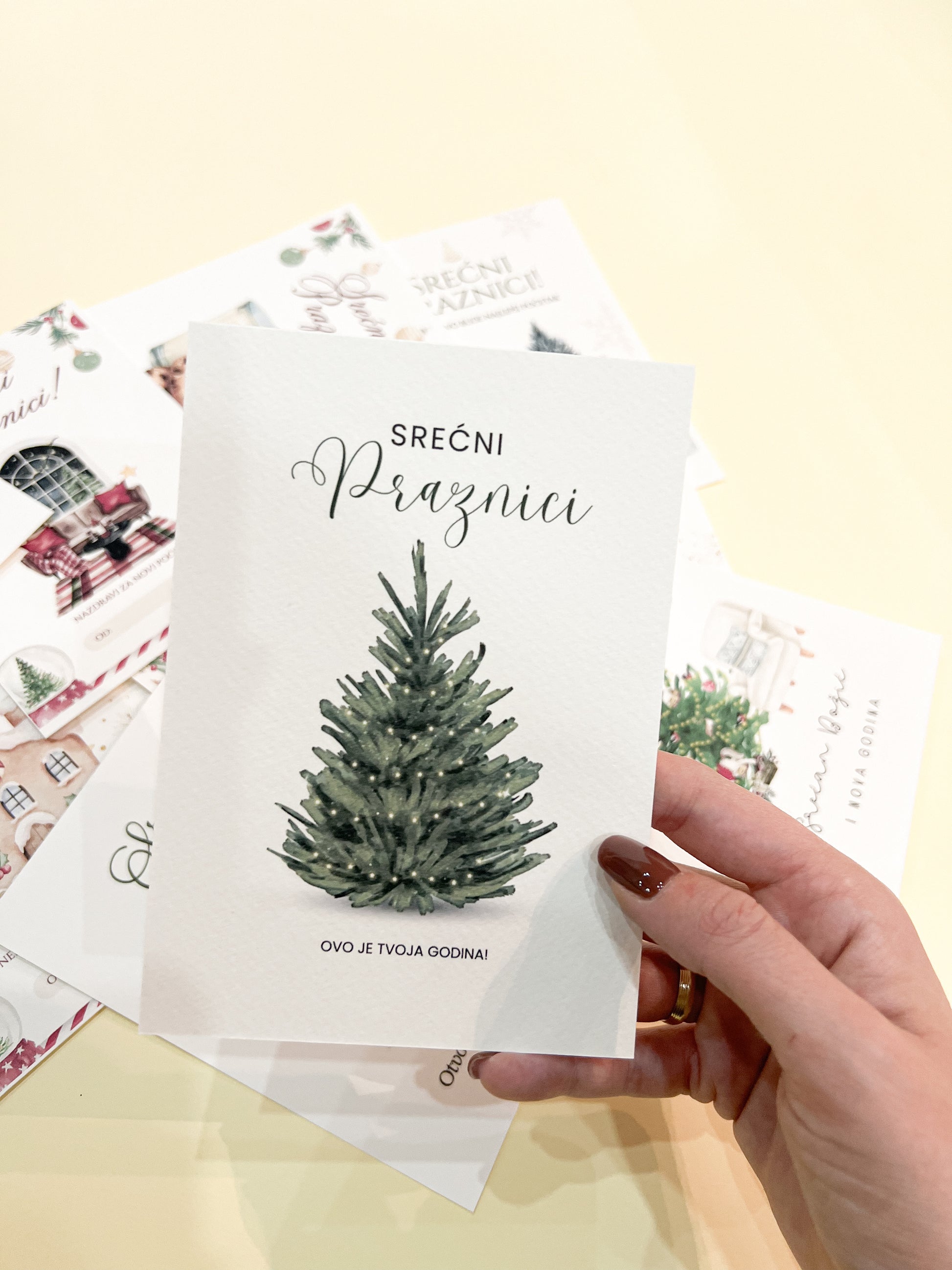 Elegantna praznična čestitka sa nežnim akvarel motivom, savršena za lične poruke i poklone.