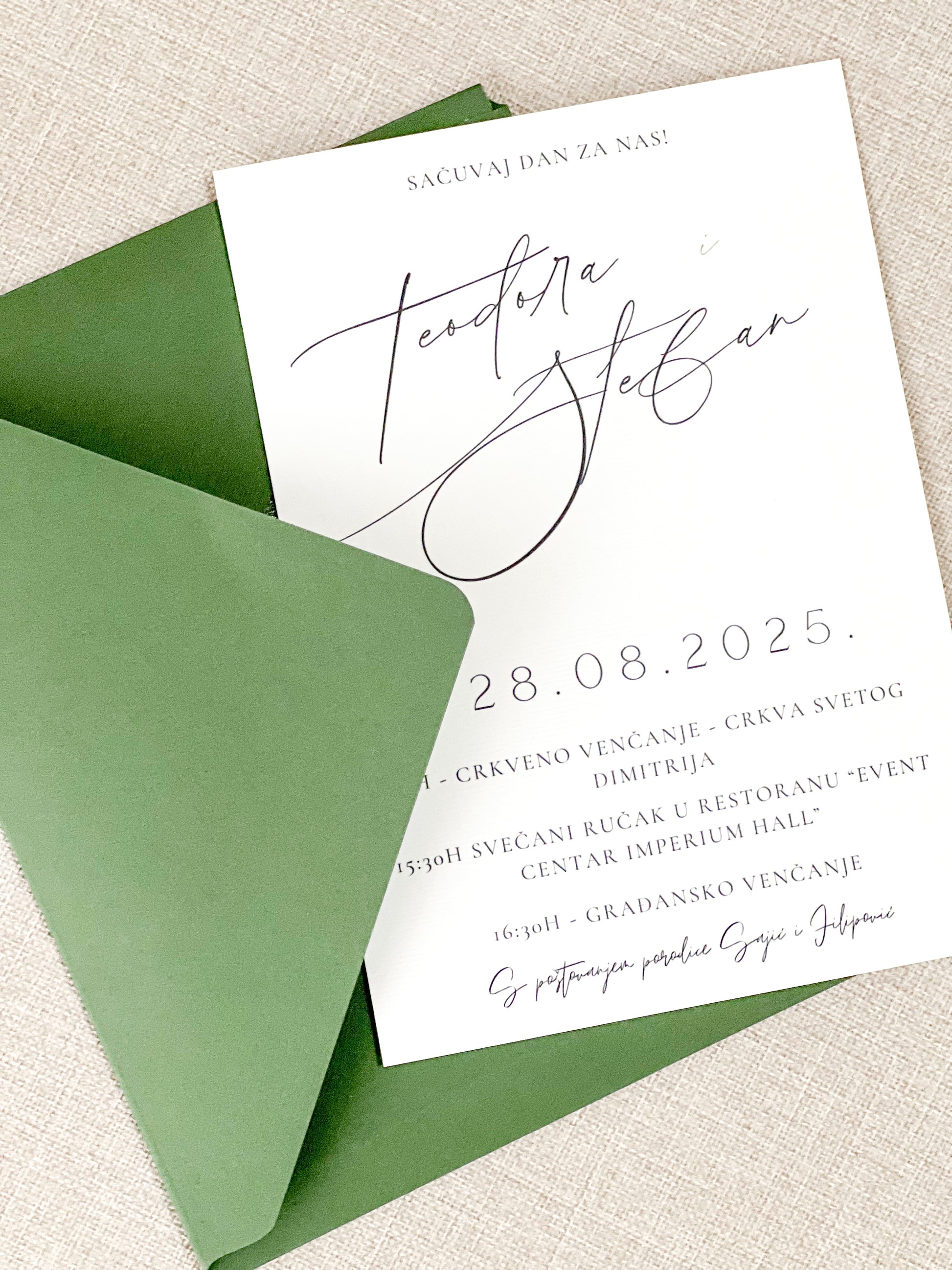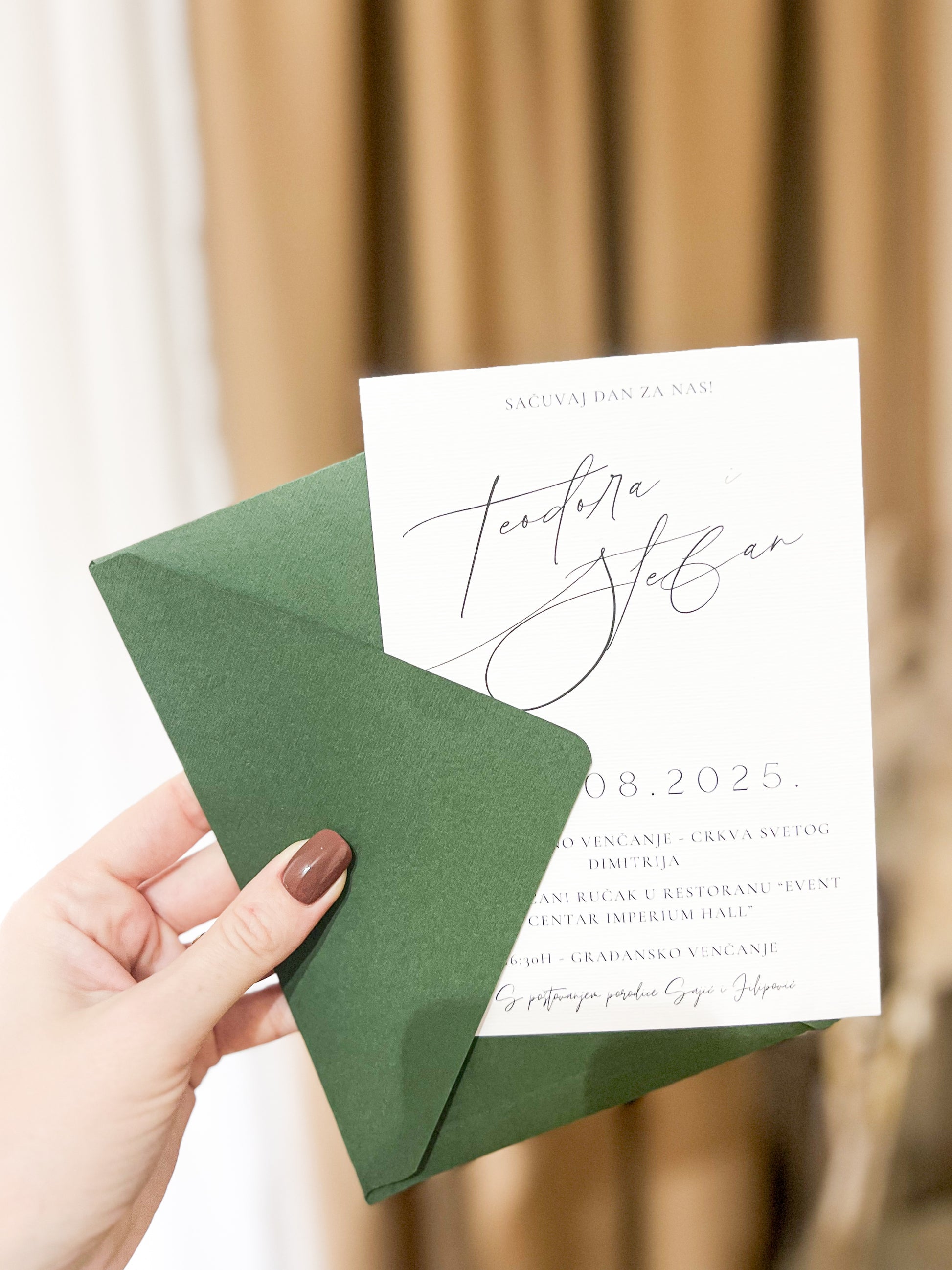 Pozivnica je dimenzija 13 × 18 cm i izrađena je od kvalitetnog reljefnog papira, koji daje suptilan, elegantan teksturni izgled i čini svaki detalj još posebnijim.