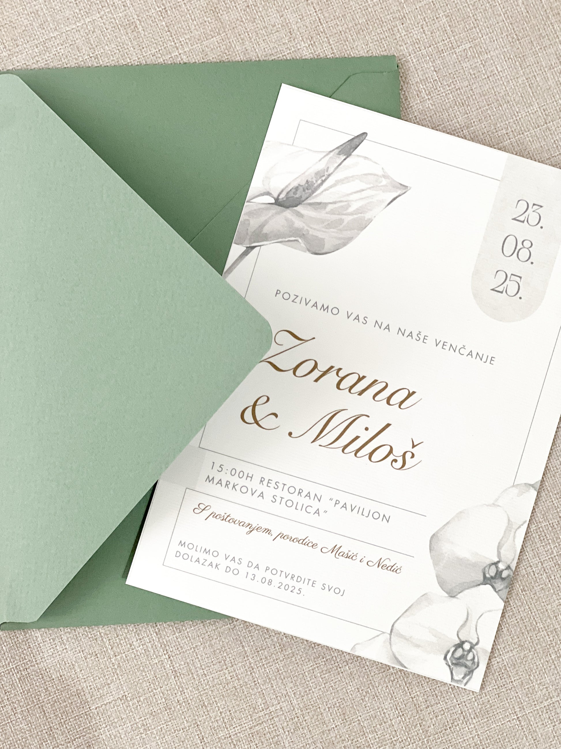 Pozivnica je dimenzija 13 × 18 cm i izrađena je od kvalitetnog reljefnog papira, koji daje suptilan, elegantan teksturni izgled i čini svaki detalj još posebnijim.