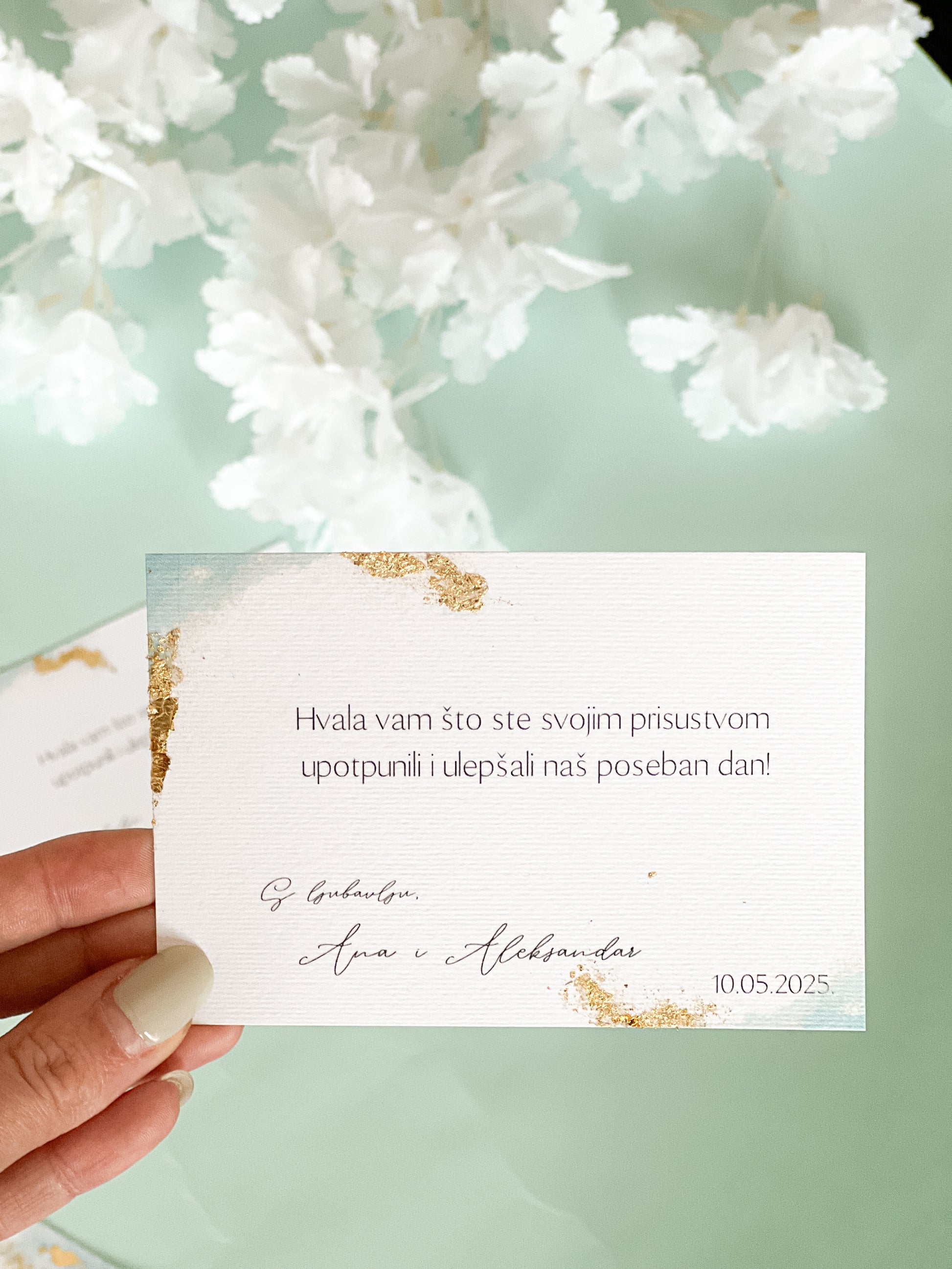 Naše zahvalnice su pažljivo dizajnirane kako bi izrazile zahvalnost vašim gostima na najlepši i najtopliji način. Elegantne, nežne i personalizovane, savršeno dopunjuju temu vašeg venčanja ili proslave. Svaka zahvalnica ručno se priprema i izrađuje sa posebnom pažnjom na detalje, kako bi ostala prelepa uspomena vašim gostima.