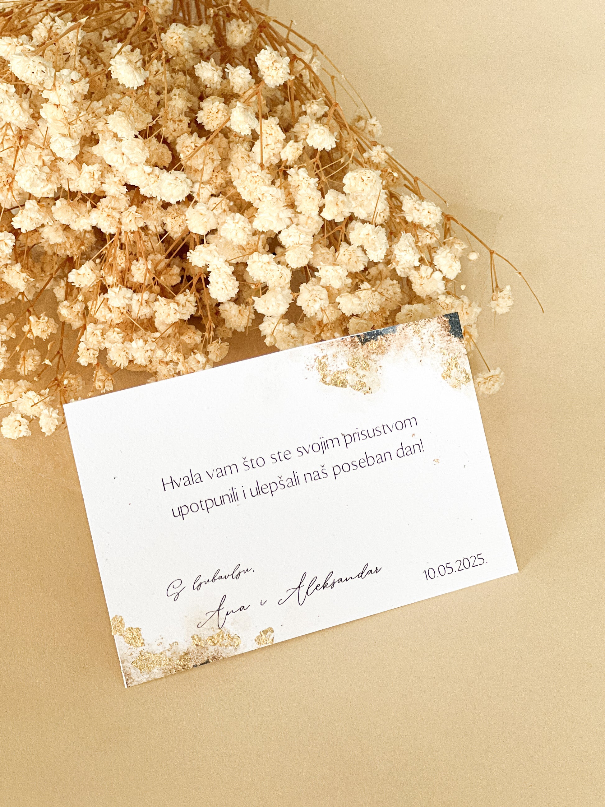 Naše zahvalnice su pažljivo dizajnirane kako bi izrazile zahvalnost vašim gostima na najlepši i najtopliji način. Elegantne, nežne i personalizovane, savršeno dopunjuju temu vašeg venčanja ili proslave. Svaka zahvalnica ručno se priprema i izrađuje sa posebnom pažnjom na detalje, kako bi ostala prelepa uspomena vašim gostima.