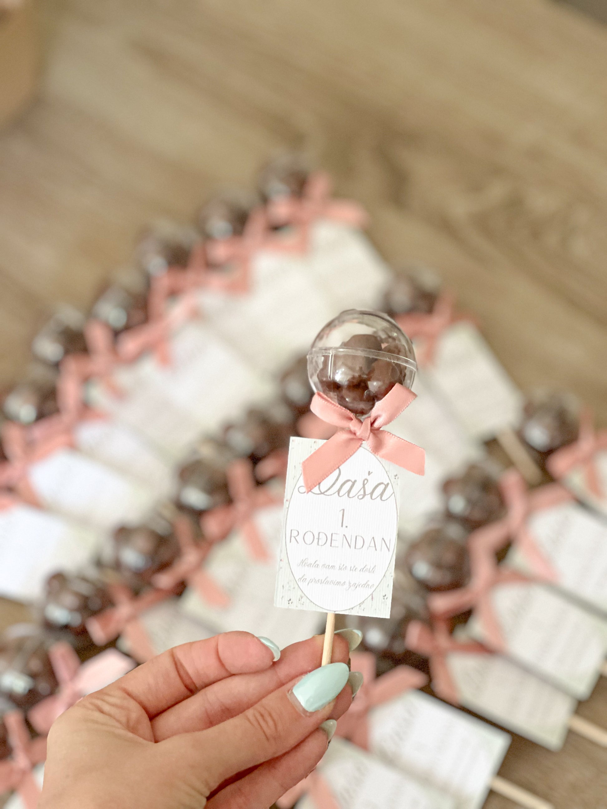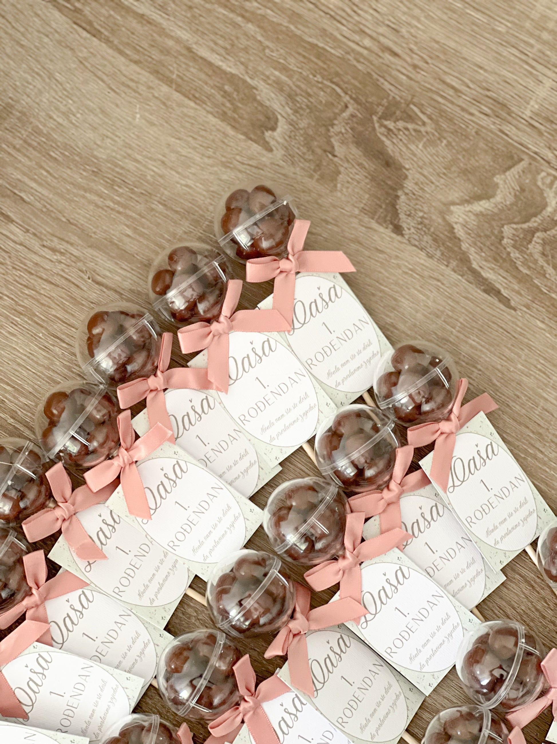 Personalizovana zahvalnica sa imenom slavljenika i porukom, ukrašena mašnicom, krije dve fine čokoladne kuglice u providnoj kugli na štapiću.